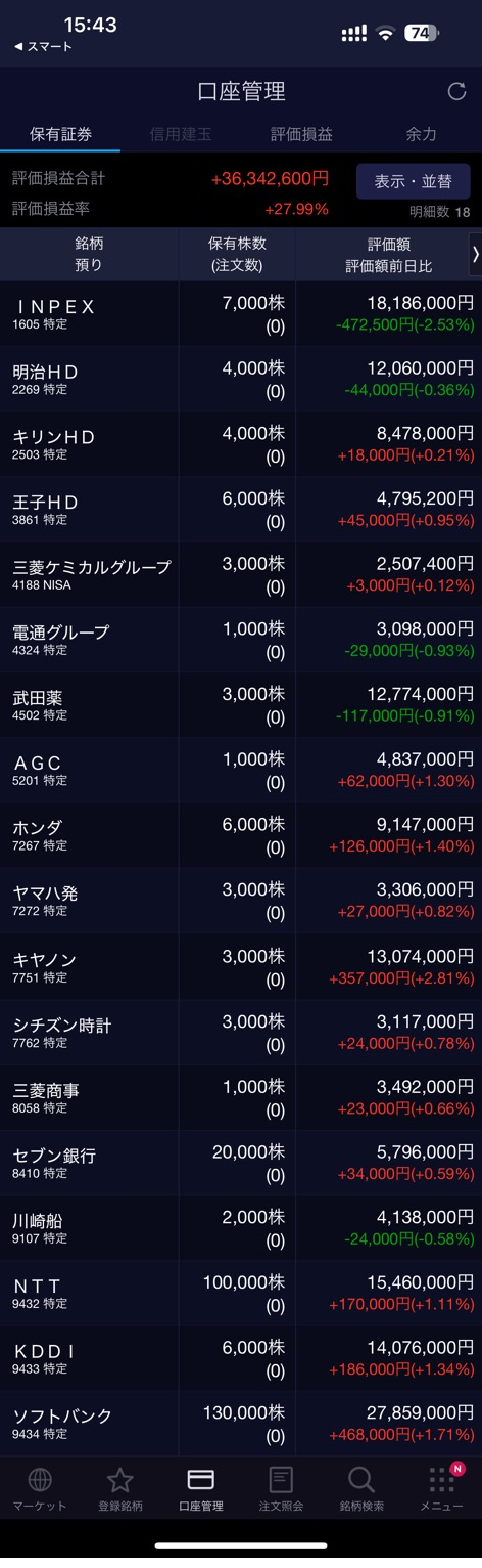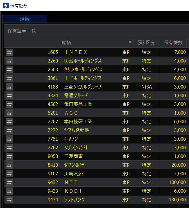 INPEX(1605)、明治HD(2269)、キリンHD(2503)、王子HD(3861)、三菱ケミカル G(4188)、電通G(4324)、武田薬品工業(4502)、AGC(5201)、ホンダ(7267)、ヤマハ発動機(7272)、キヤノン(7751)、シチズン時計(7762)、三菱商事(8058)、セブン銀行(8410)、川崎汽船(9107)、NTT(9432)、KDDI(9433)、ソフトバンク(9434)の合計18銘柄を保有中です。