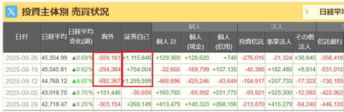 また、バリュエーション指標から判断して空売りをしている個人はかなり厳しい状況にあると思います。なお、事業法人のマイナスは一時的なものであり、10月1日から各社で自社株買いが実施され始めていますから、次週からはプラスに転じて継続的な買いが行われます。