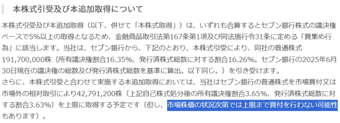あと、市場株価の状況次第では上限まで買付を行わない可能性の記述もあるのでこれも注意。