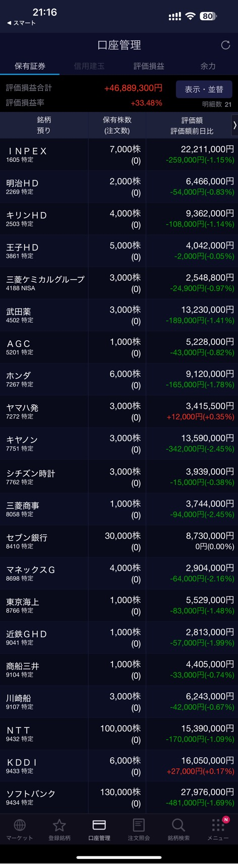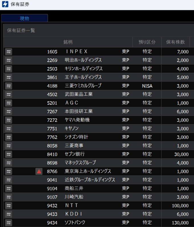 INPEX(1605)、明治HD(2269)、キリンHD(2503)、王子HD(3861)、三菱ケミカル G(4188)、武田薬品工業(4502)、AGC(5201)、ホンダ(7267)、ヤマハ発動機(7272)、キヤノン(7751)、シチズン時計(7762)、三菱商事(8058)、セブン銀行(8410)、マネックスG(8698)、東京海上HD(8766)、近鉄GHD(9041)、商船三井(9104)、川崎汽船(9107)、NTT(9432)、KDDI(9433)、ソフトバンク(9434)の合計21銘柄を保有中です。