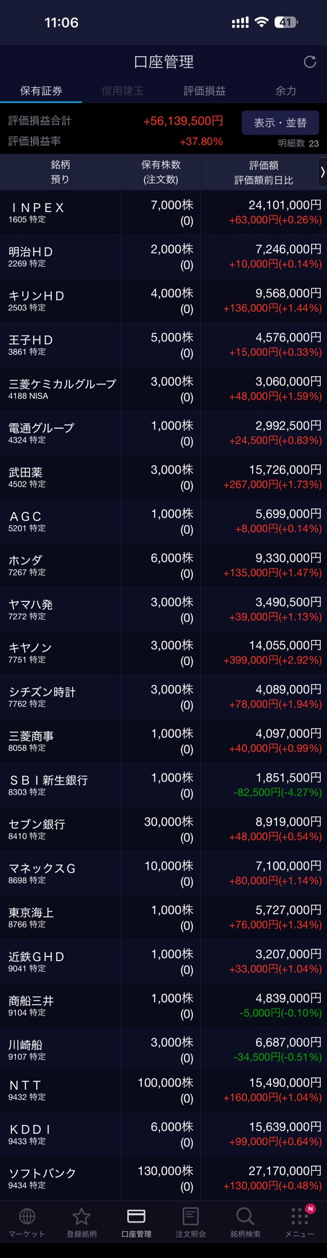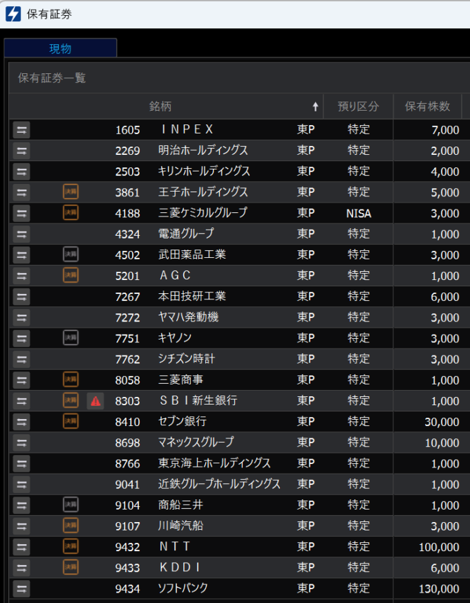 INPEX(1605)、明治HD(2269)、キリンHD(2503)、王子HD(3861)、電通グループ(4324)、三菱ケミカルG (4188)、武田薬品工業(4502)、AGC(5201)、ホンダ(7267)、ヤマハ発動機(7272)、キヤノン(7751)、シチズン時計(7762)、三菱商事(8058)、SBI新生銀行(8303)、セブン銀行(8410)、東京海上(8766)、マネックスG(8698)、近鉄GHD(9041)、商船三井(9104)、川崎汽船(9107)、NTT(9432)、KDDI(9433)、ソフトバンク(9434)の合計23銘柄を保有中です。