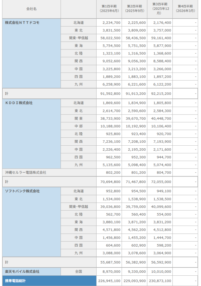 2025年12月末時点での4キャリアの「携帯電話・スマホの契約者数」が更新されました。
