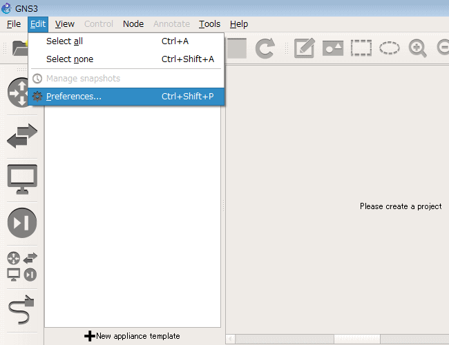 先ず、デスクトップ上のGNS3のアイコンをダブルクリックしてGNS3を起動させると、以下の