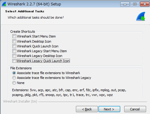 WinPcapとUSBcapのインストールが完了すると、以下のWiresharkのインストール画面が表示されるので