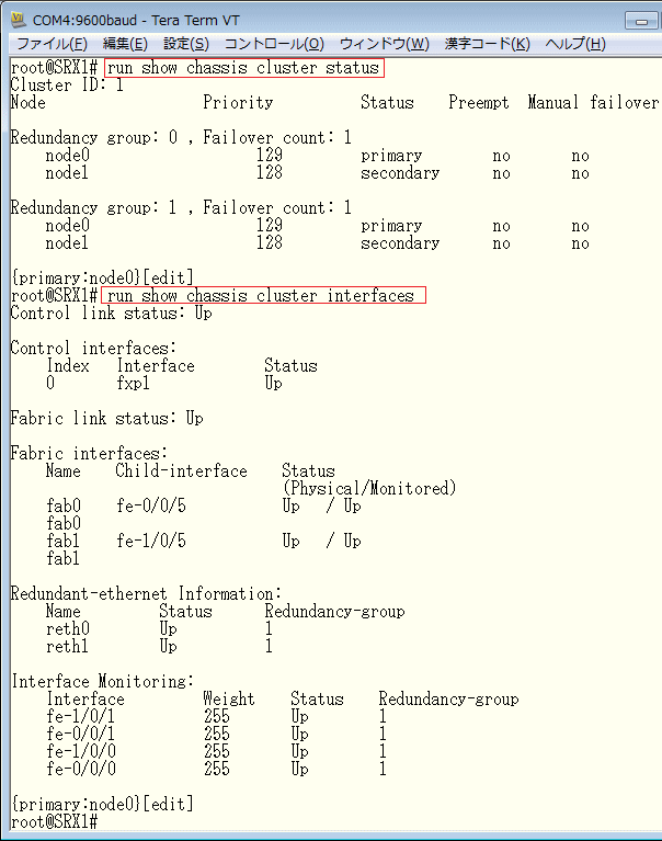◆ 実行例 : Redundancy Group 1 と 0 の Primary を node1 にフェイルーオーバー