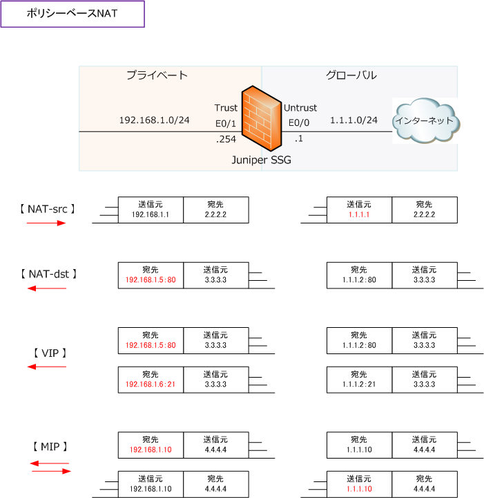 まず上図で「NAT-src、NAT-dst、VIP、MIP」の概要を理解しましょう。NAT-src、NAT-dst については