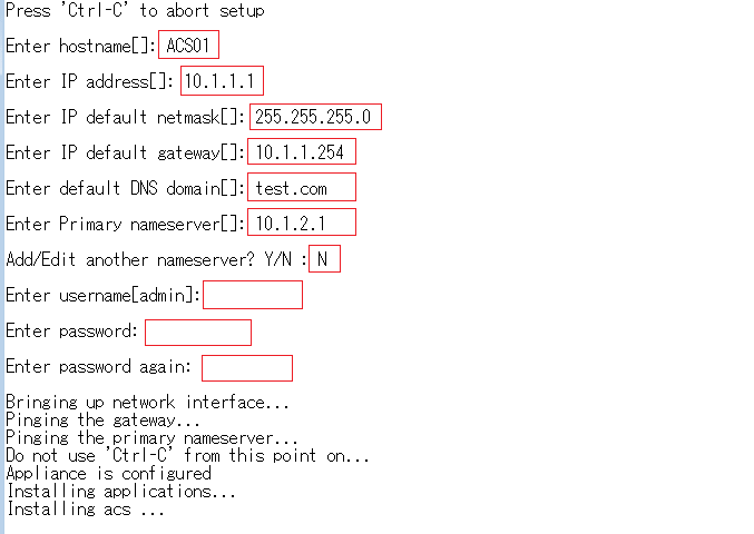 プライマリDNSサーバ、ACSにConsole接続とSSHログインするためのユーザ名とパスワードを入力します。