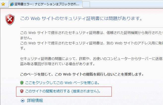 と入力します。すると以下の画面が表示されるので「このサイトの閲覧を続行する」を選択して続行します。