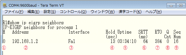 EIGRPのネイバーテーブルのステータスは、show ip eigrp neighbors コマンドで確認できます。