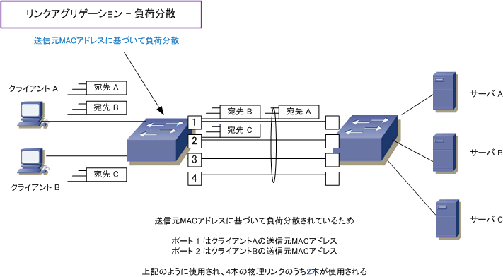 ※ 負荷分散には送信元MACアドレス、宛先MACアドレスに基づく方式以外に、送信元IP / 宛先IPアドレスに基づく方式もあります。