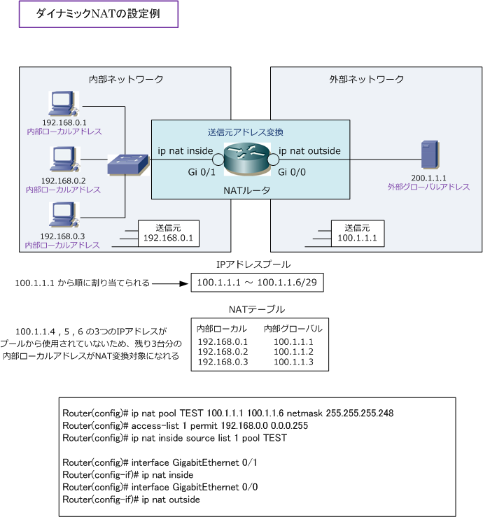 ダイナミックNATの設定手順は以下。スタティックNATは1対1の変換でしたが、ダイナミックNATは
