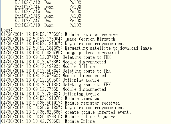 2014 Apr 30 13:49:27 Nexus5548 %$ VDC-1 %$ %PFMA-2-FEX_STATUS: Fex 102