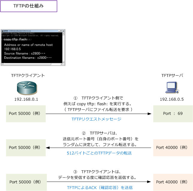 であり、以降のTFTPクライアントとサーバとの通信ではTFTPサーバはランダムなポート番号を使用します。