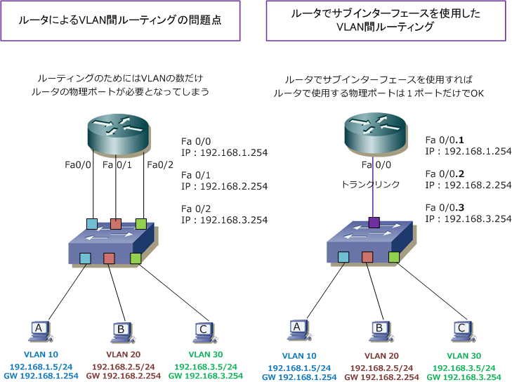 できません。これをルータを使用してVLAN間ルーティングする場合、右下図のような構成で実現します。