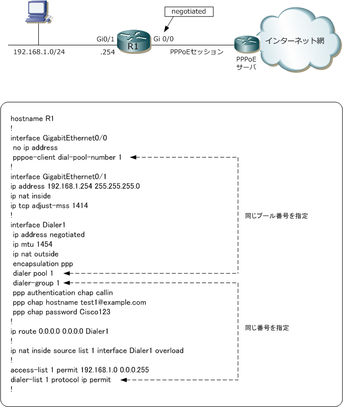 pppoe-client dial-pool-numberコマンドで関連付けを行います。pppoe-client dial-pool-numberで指定